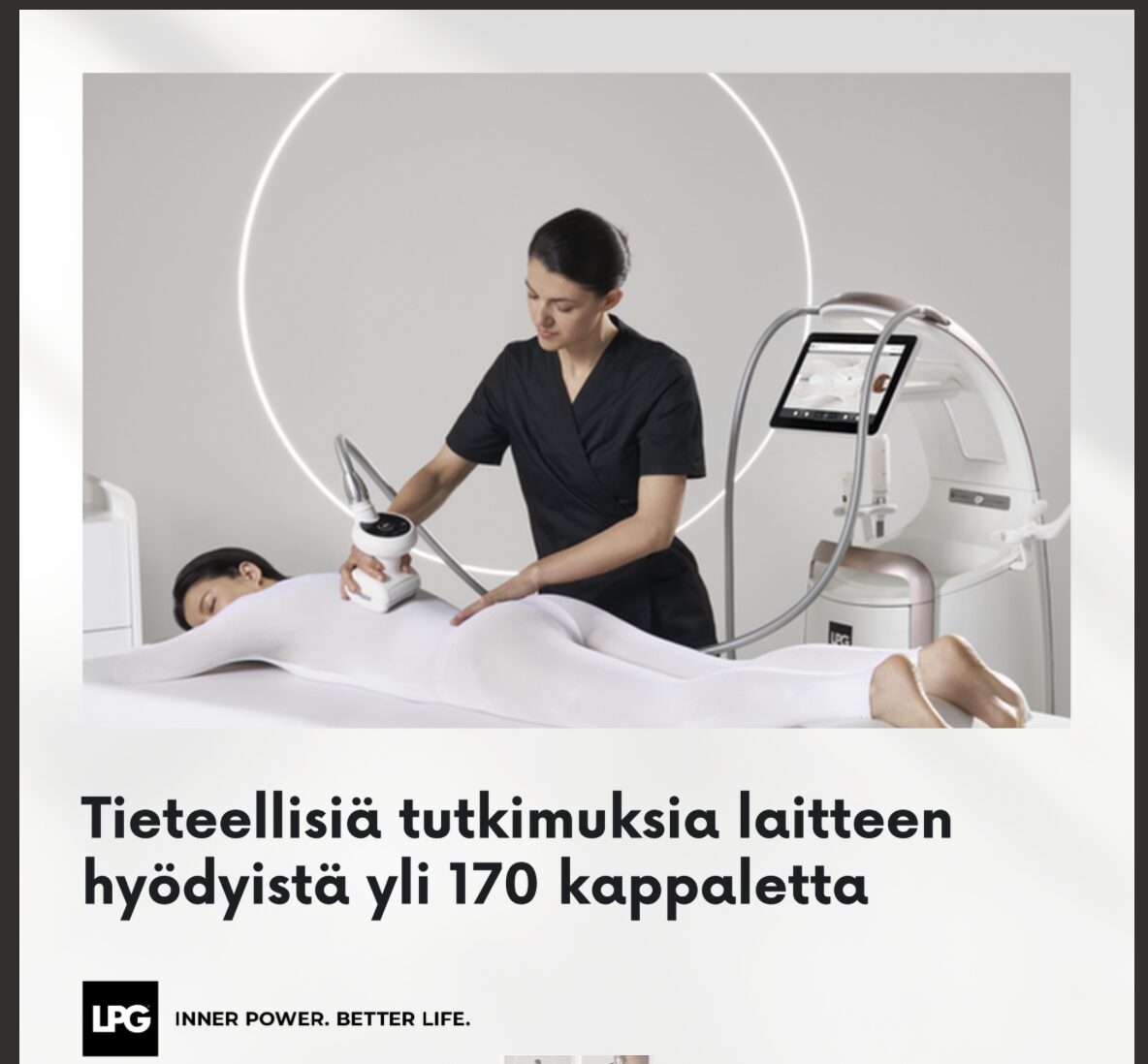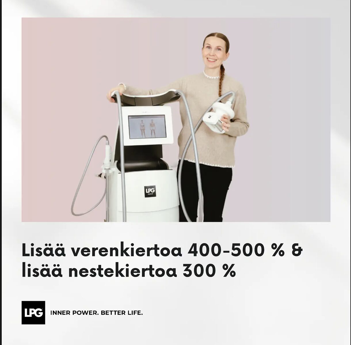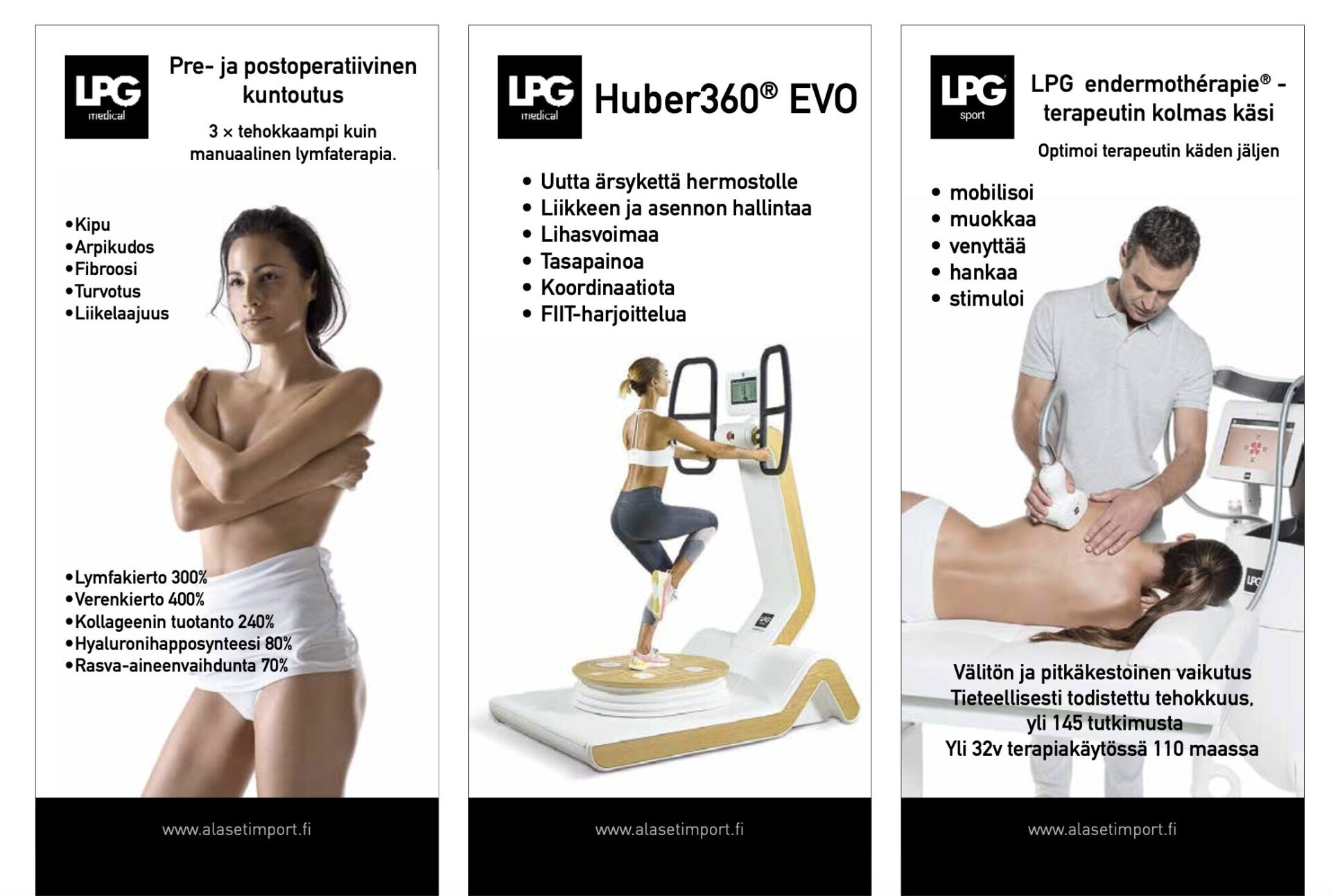 Olemme toimineet LPG-laitteiden maahantuojana jo 20v ja laitekehittjän ranskalaisen Lpg Systemsin partnerina. Meillä on pitkä kokemus laitteiden käytöstä omassa fysiossamme, yli 26 v. Tarjoamme yrittäjille maailman monipuolisimpia laitteita fysioterapiaan, kuntoutukseen, hyvinvointiin, kauneudenhoitoon. Hoidon vaikutuksista on tehty yli 170 tieteellistä tutkimusta. Hoitolaitteiden teknologia on patentoitu, ainutlaatuinen joka löytyy ainoastaan Lpg Systemsin kehittämistä laitteista.ESITTELYSSÄ ovat Cellu M6 Alliance medical , Cellu m6 Infinity medical, uusin laite, Huber 360evo, Stendo. Tervetuloa osastollemme 341.